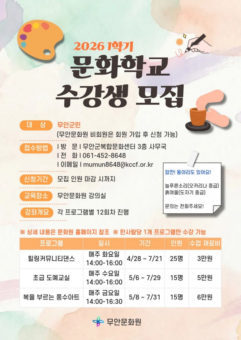 - 공고26-22026년 문화학교 1학기 수강생 모집 공고.hwp (97.0K) 8회 다운로드 | DATE : 2026-04-02 09:47:31