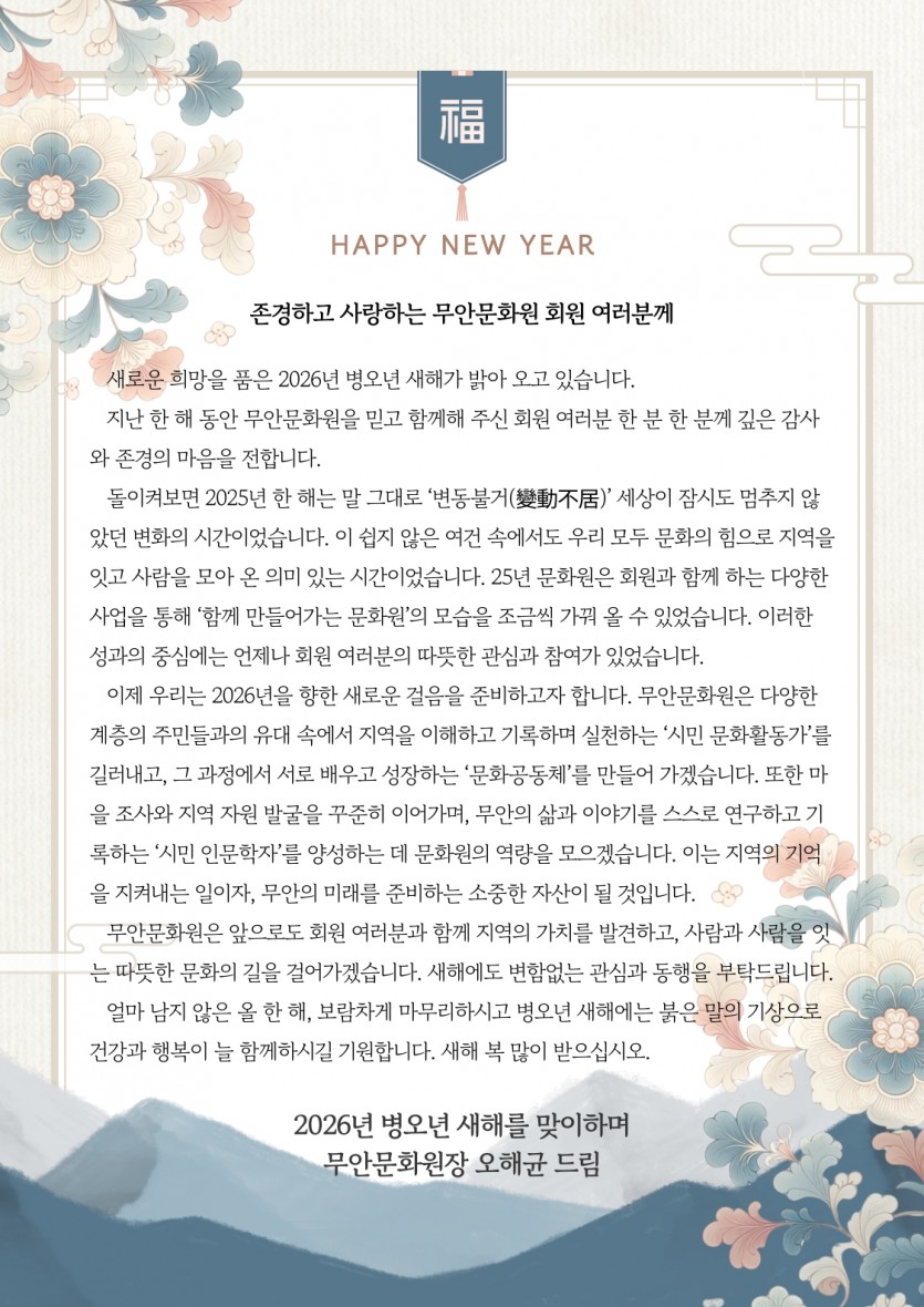 2025년 송년사 페이지 정보 작성자 무안문화원 댓글 0건 조회 61회 작성일 26-01-02 09:28 본문 새해 복 많이 받으세요! - 무안문화원 일동 - 목록 이전글26년도 무안문화원 대의원 모집공고문 26.01.16 다음글<무안문화원 성과공유 전시회 - 일상 속 예술, 우리의 이야기 展> 개최 25.12.05 댓글목록 댓글목록 등록된 댓글이 없습니다.